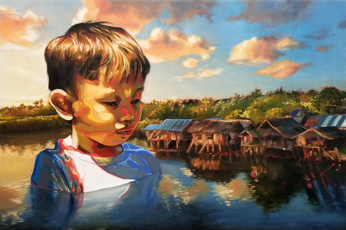 The backgrounds of my paintings depict easily recognizable architecture and landscapes from the Philippines and Chicago. These are places where my ancestors originated and where they settled. But by simply pasting children into these scenes, the overall impression often seems disjointed, that the child does not belong.